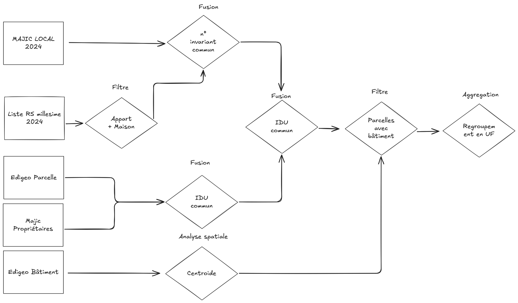 - Donnée provenant d'un algrithme composé de traitement de type : filtre spatial, filtre attributaire, recomposition attributaire, centroïde de polygone, standardisation des attributs, aggregations, fusion des tables,